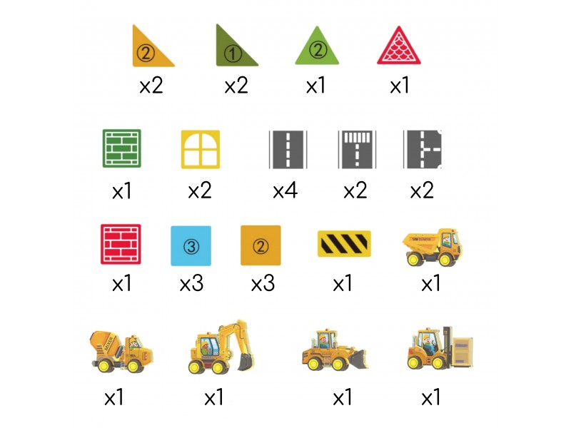 - Rinkinyje yra 5 skirtingos statybinės mašinos su laisvai besisukančiais ratais.