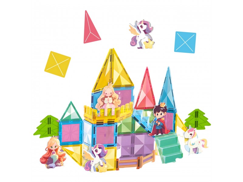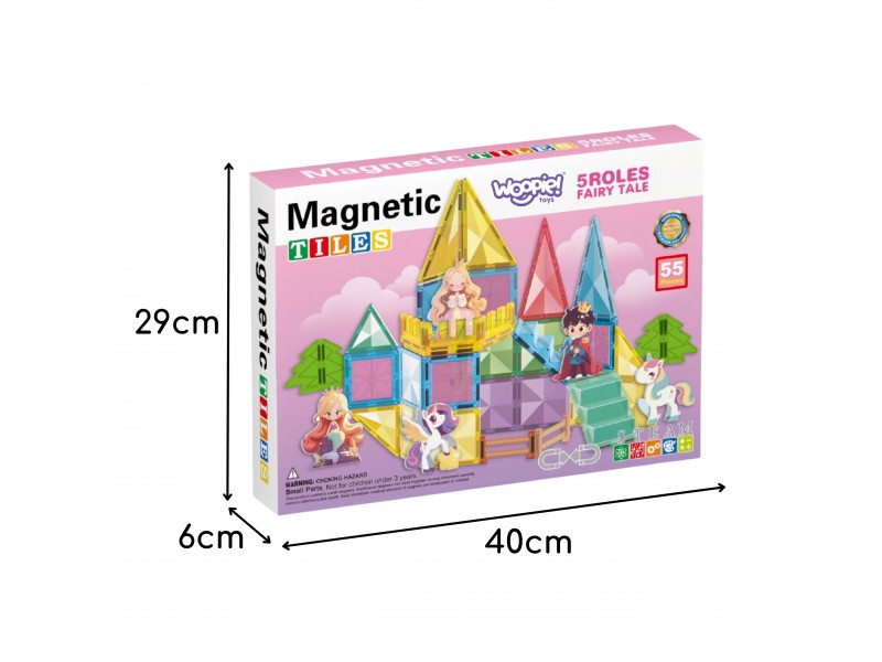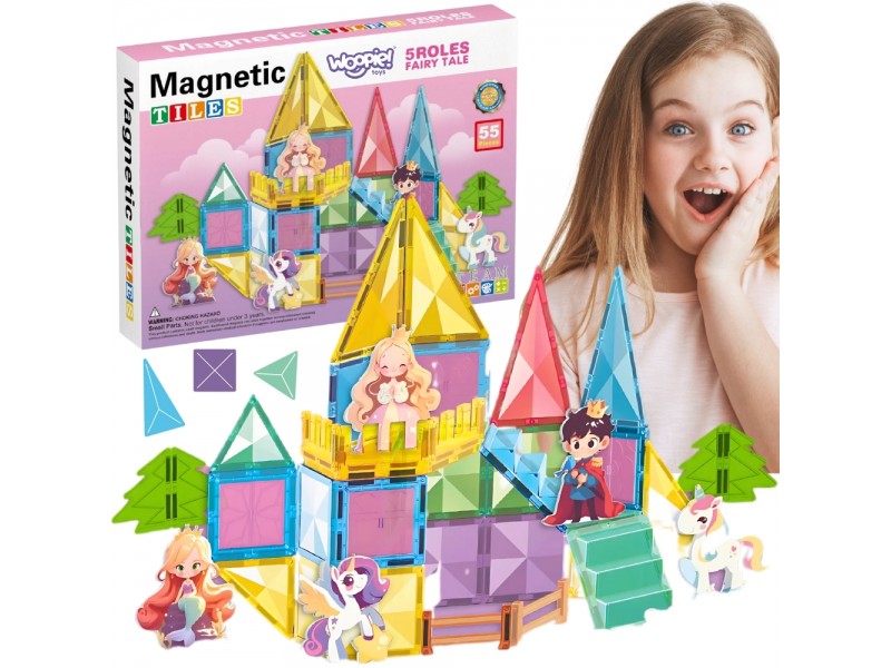 Šis unikalus magnetinių kaladėlių rinkinys iš Woopie prekės ženklo nukels jūsų vaiką į magišką kūrybos ir pasakų pasaulį. Rinkinį sudaro 55 spalvingos detalės, tarp kurių magnetinės plokštelės, laiptai, tvoros ir žavios figūrėlės, leisiančios jūsų mažyliui pastatyti svajonių pilį princesei, princui ir jų ištikimiems vienaragiams. Konstravimas su magnetinėmis kaladėlėmis ne tik smagus, bet ir naudingas – jis lavina smulkiąją motoriką, erdvinį suvokimą ir vaizduotę, o žaidimas su figūrėlėmis skatina kurti istorijas ir įsitraukti į vaidmenų žaidimus.