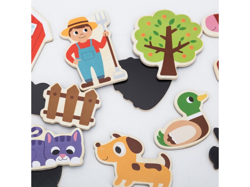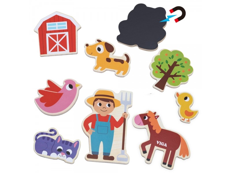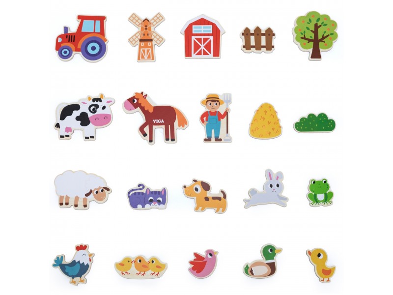 - Rinkinį sudaro 20 medinių magnetinių figūrėlių, vaizduojančių ūkio gyvūnus.