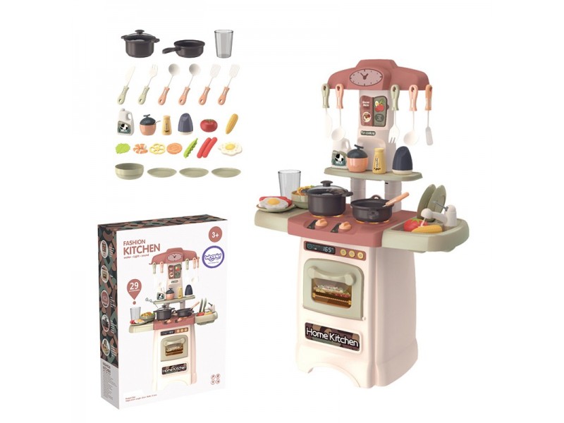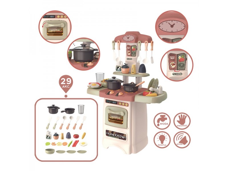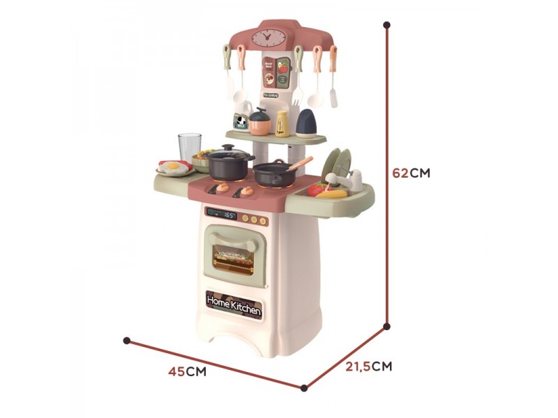 Virtuvėlėje yra imitacijos: orkaitės su ekranu ir mygtukais, klasikinio laikrodžio, meniu lentos, kriauklės, čiaupo, lėkščių džiovyklos, stalviršio, degiklių su rankenėlėmis, lentynos priedams ir kabliukų virtuvės įrankiams. Daugybė maisto produktų, prieskonių ir virtuvės reikmenų (pvz., kiaušinis, pipirai, lėkštės) užtikrins, kad jūsų vaikui niekada nenusibos gaminti vis įvairesnius patiekalus ir organizuoti vaišes draugams. Prisiminkite, kad vaikai mėgsta mėgdžioti savo tėvus, o vaidmenų žaidimai puikiai lavina mažylio vaizduotę ir kūrybiškumą!