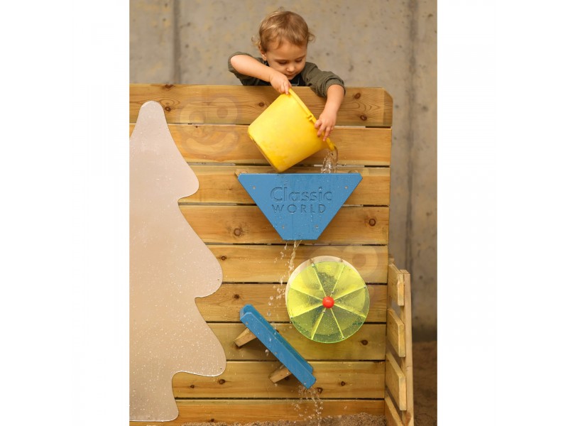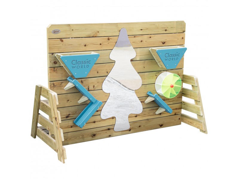 Ši medinė žaidimų sienelė iš "Classic World" yra puikus sprendimas, siekiant paįvairinti vaikų žaidimų aikštelę ar nuosavą kiemą. Tai daugiafunkcinis rinkinys, apjungiantis aktyvių pramogų zoną su patogia poilsio vieta. Gaminys pagamintas iš aukštos kokybės medienos, padengtos netoksišku impregnantu, todėl yra visiškai saugus vaikams. Dešinėje pusėje esantis piltuvėlis kviečia supilti smėlį ir stebėti, kaip jis byrėdamas suka malūnėlį. Kairėje pusėje esantis kitas piltuvėlis leidžia smėliui čiuožti stačiais šonais, sukuriant smėlio čiuožyklos efektą. Centre įmontuotas eglutės formos veidrodinis paviršius tikrai patrauks kiekvieno mažylio dėmesį! Kitoje sienelės pusėje įrengta poilsio zona – patogus medinis suoliukas. Ant jo vaikas gali prisėsti pailsėti, o po žaidimų susidėti žaislus ant apatinės lentynos.
