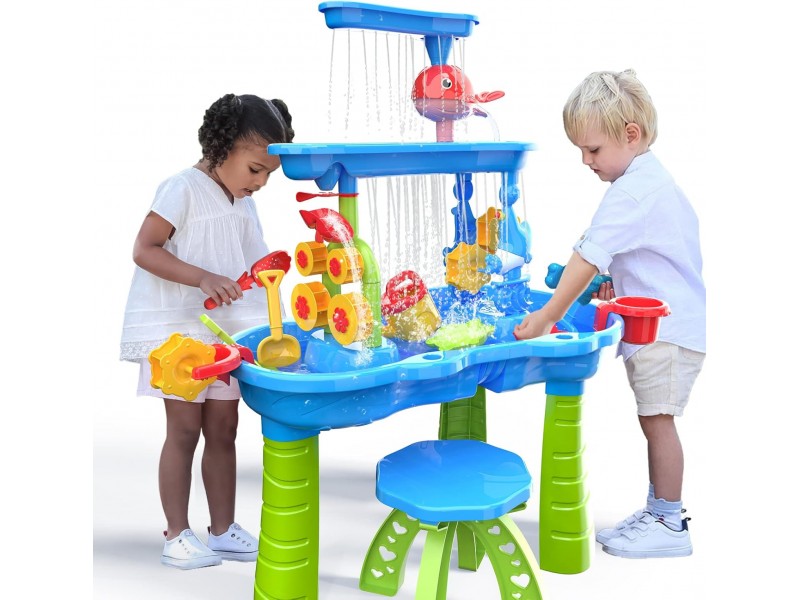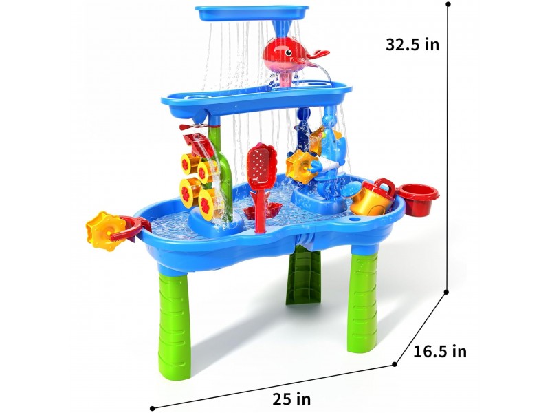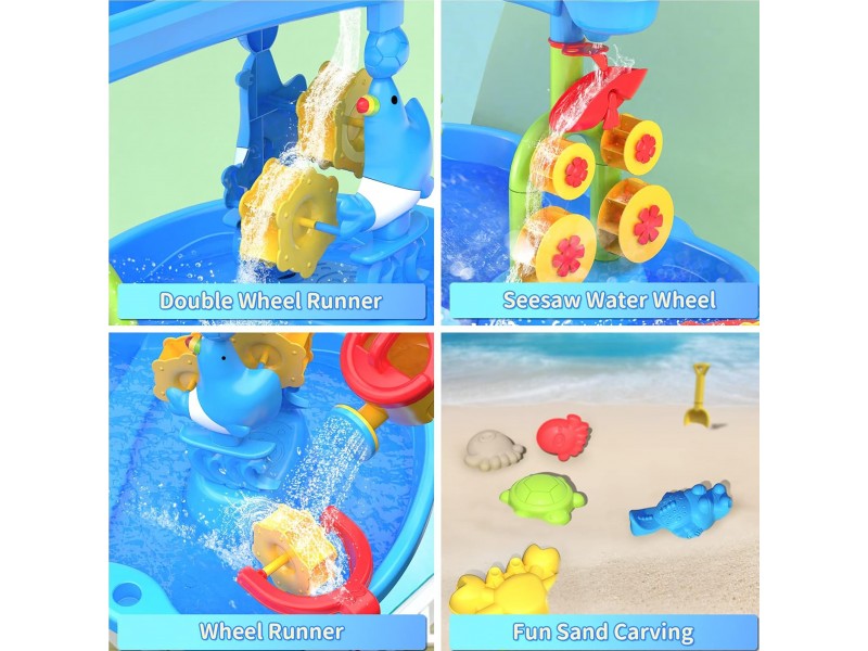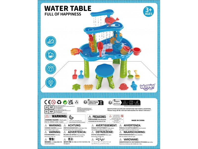 Išskirtinis prekės ženklo Woopie vandens staliukas – tai idealus būdas smagiai leisti laiką ištisus metus, nepriklausomai nuo oro sąlygų. Tai ne tik fantastiška pramoga karštomis vasaros dienomis, bet ir puikus būdas įveikti nuobodulį vėsesniu oru žaidžiant viduje. Šis unikalus staliukas išsiskiria pažangia, 3 lygių vandens sistema, kuri tikrai sužavės kiekvieną vaiką! Mažieji tyrinėtojai gali naudoti laistytuvą, kad įpiltų vandens į viršutinį rezervuarą, ir stebėti, kaip krioklys teka žemyn į apatinį indą, išjudindamas vandens malūnėlį. Be to, dėl pridedamų priedų šis staliukas taip pat gali būti naudojamas žaidimams su smėliu – tiek paprastu, tiek kinetiniu. Tai universalus žaislas kiekvienai progai, skatinantis kūrybiškumą ir motoriką.