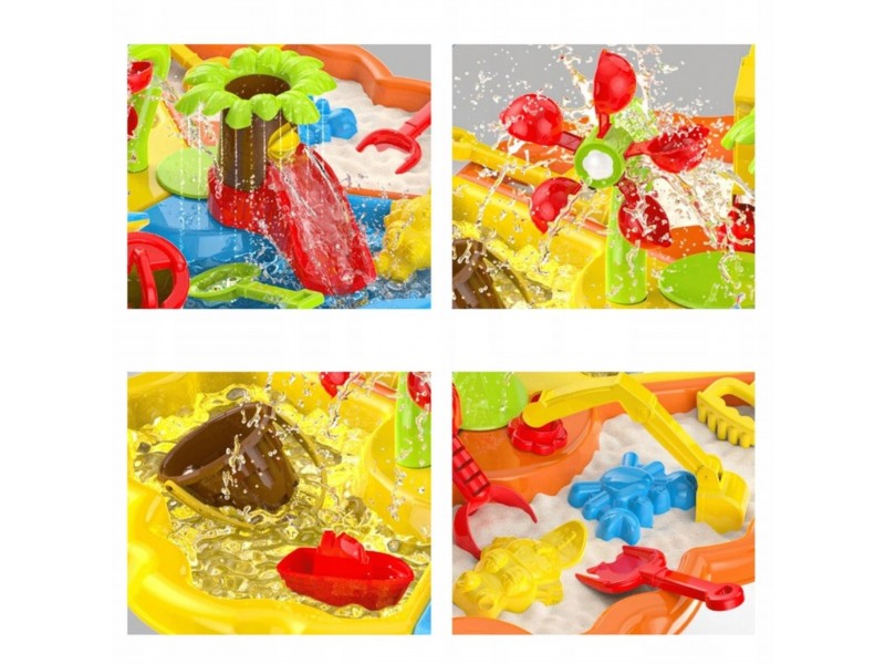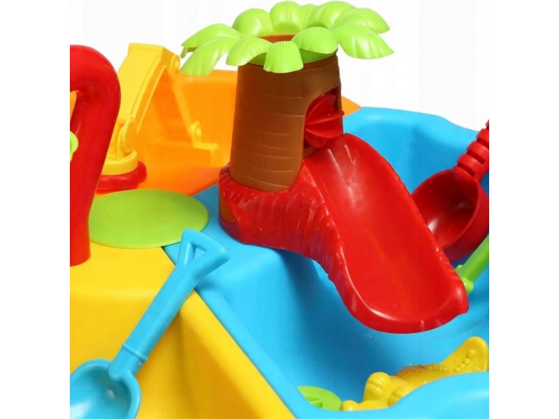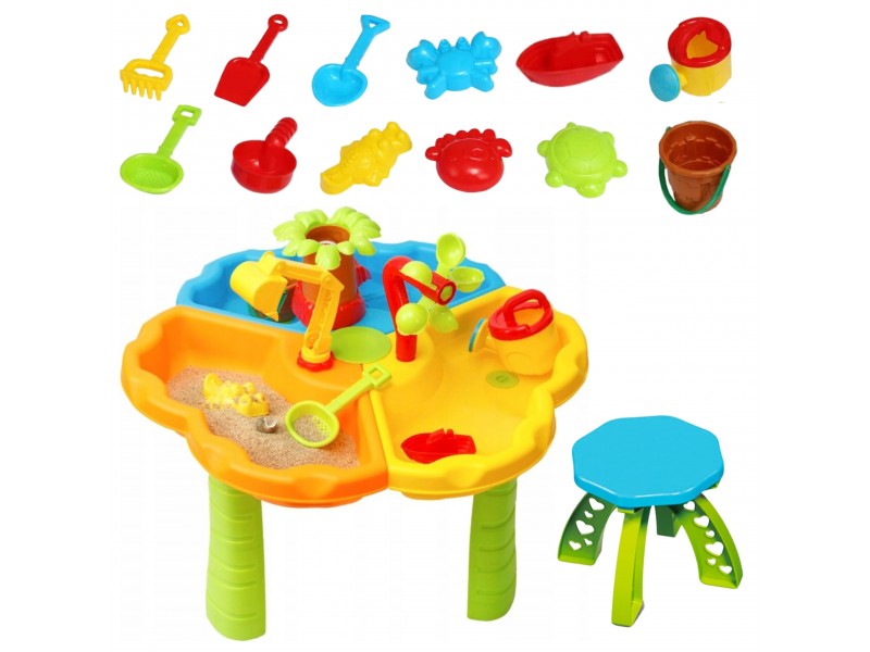 Staliukas pagamintas iš saugaus, patvaraus ir lengvai valomo plastiko, be jokių aštrių briaunų, todėl yra visiškai saugus mažyliams. Trijų dalių staliuko konstrukcija leidžia vaikams vienu metu eksperimentuoti su skirtingomis medžiagomis – smėliu, vandeniu ir rinkinio priedais. Kiekvienas rinkinio elementas sukurtas taip, kad žadintų vaiko vaizduotę: čia rasite mini ekskavatorių, medelį-piltuvėlį, vandens malūnėlį, smėlio formeles, laivelį, kastuvėlius ir daugybę kitų spalvingų aksesuarų. Rinkinyje taip pat yra patogi ir ergonomiška kėdutė, užtikrinanti komfortą žaidimo metu. Visą komplektą lengva surinkti ir išardyti nenaudojant jokių įrankių, todėl jį patogu pasiimti į keliones.