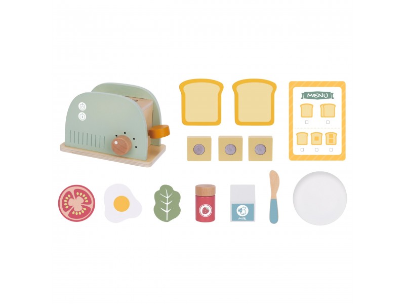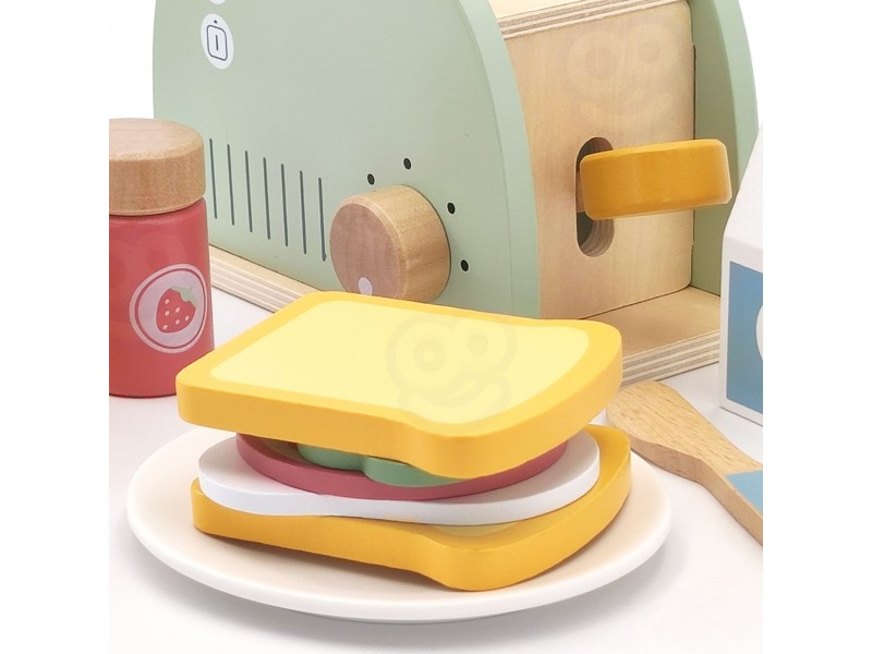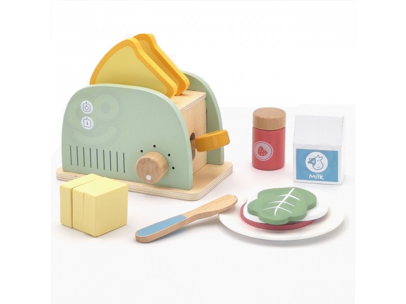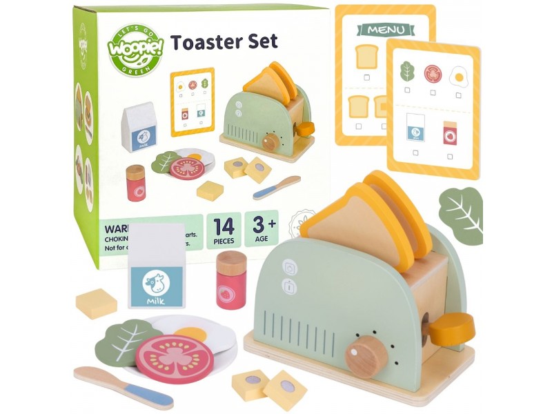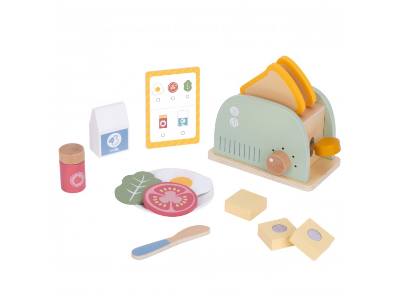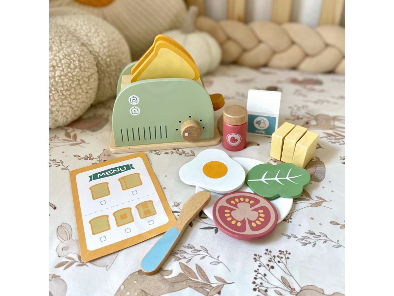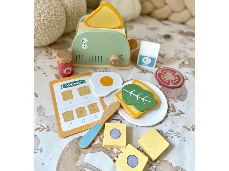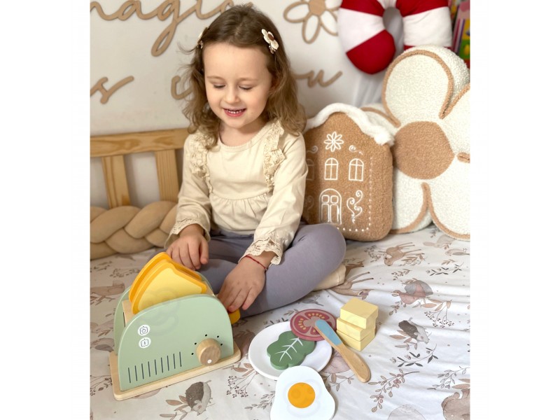 Šis medinis pusryčių rinkinys su skrudintuvu yra puikus pasirinkimas vaikams, kurie mėgsta žaisti namus, gaminti maistą ir mėgdžioti suaugusiuosius. Įkvėptas kasdienės veiklos virtuvėje, šis rinkinys leis paruošti gardžius skrebučius, keptą kiaušinį ar sumuštinį su įvairiais priedais. Žaisdamas vaikas gali įsijausti į mažojo virėjo vaidmenį, kūrybiškai lavinti socialinius įgūdžius bei vaizduotę. Visos dalys pagamintos iš saugios, kruopščiai nušlifuotos medienos ir nudažytos netoksiškais, pastelinų spalvų dažais. Tai ne tik gražus, bet ir tvirtas bei ilgaamžis žaislas, puikiai tinkantis tiek savarankiškiems žaidimams, tiek bendram gaminimui su tėveliais ar draugais. Tai ideali dovanos idėja, kuri moko per žaidimą ir padeda ugdyti kasdienius įgūdžius.