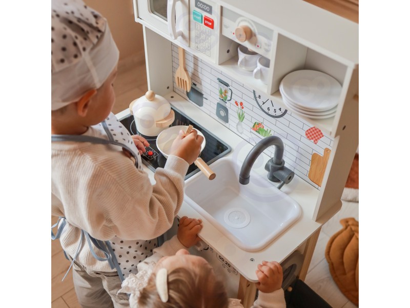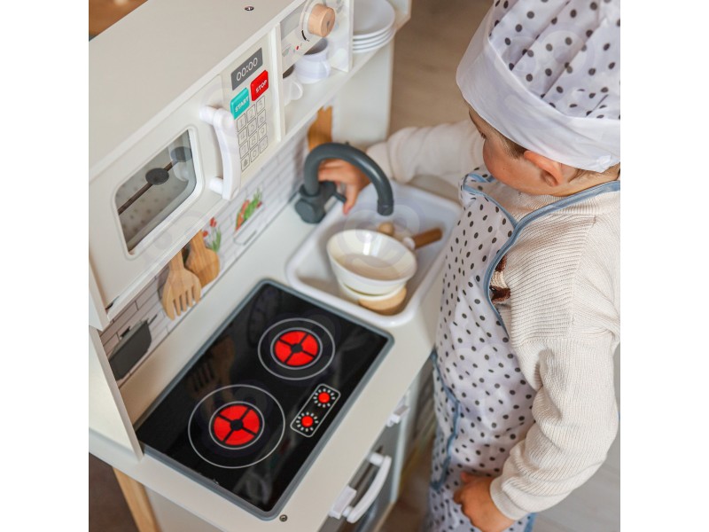 • Interaktyvūs elementai: indukcinė kaitlentė šviečia ir skleidžia tikroviškus gaminimo garsus, o mikrobangų krosnelėje dega švieselė.