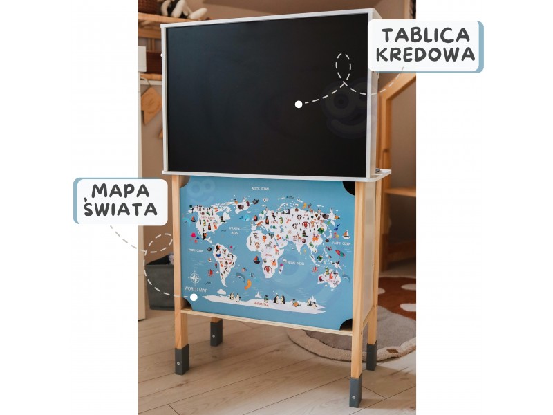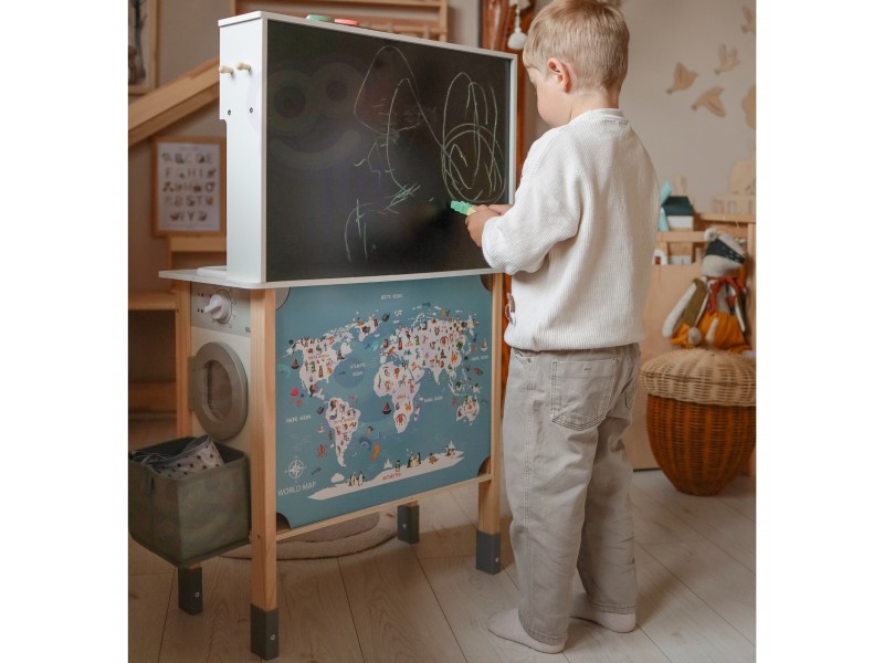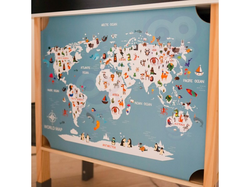 • Kitoje pusėje laukia staigmena – didelė kreidinė lenta ir spalvingas pasaulio žemėlapis, kurie įkvėps piešti, mokytis ir pažinti žemynus bei įvairias kultūras.
