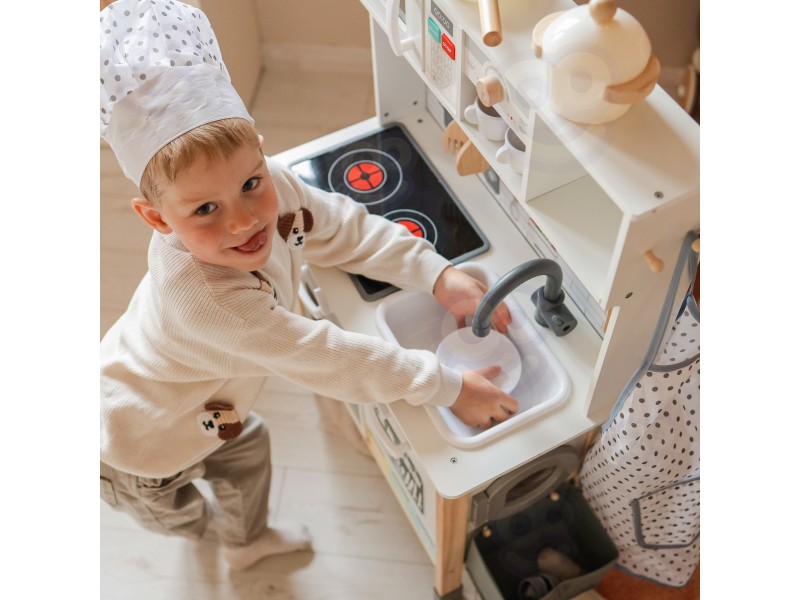 • Virtuvėlės priekyje įrengta moderni kulinarijos zona su realistiškomis detalėmis: kavos aparatas, mikrobangų krosnelė, kriauklė, orkaitė, indaplovė ir indukcinė kaitlentė užtikrins įtraukiančius ir smagius žaidimus.