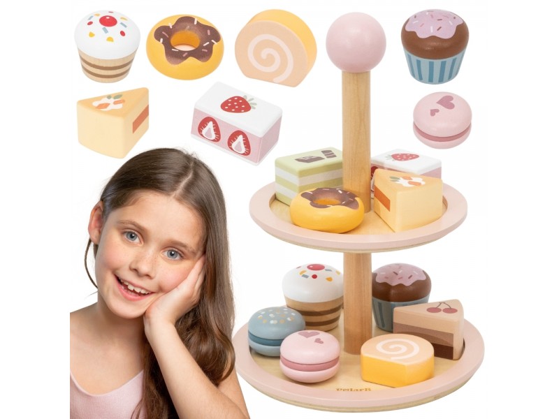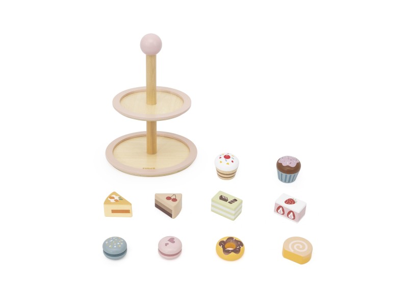 - Rinkinį sudaro dviejų aukštų medinė tortinė ir 10 spalvingų saldumynų.