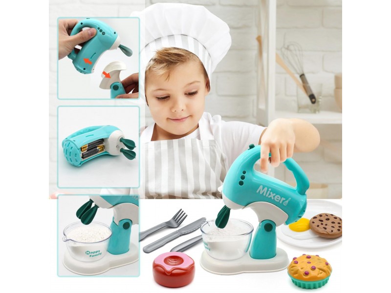 - Žaislinis mikseris su besisukančiais plaktuvais ir dubeniu.